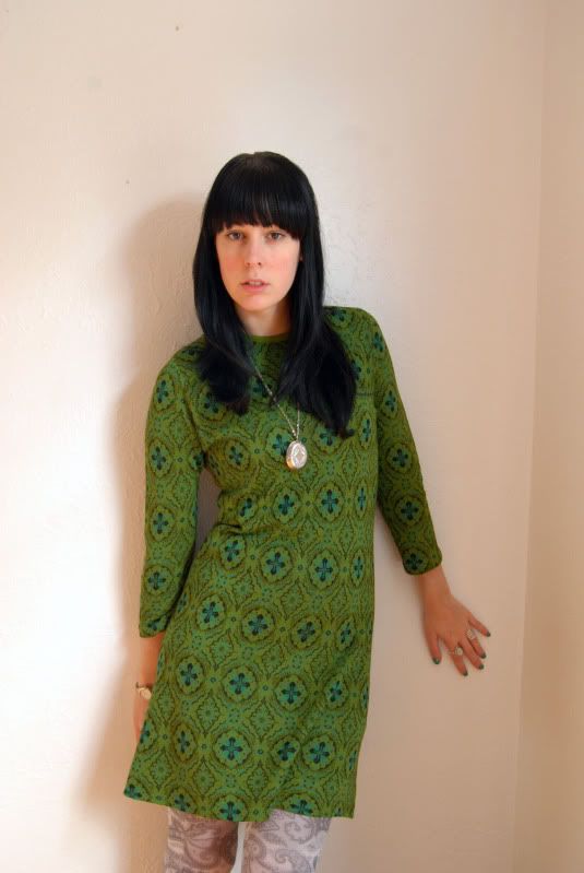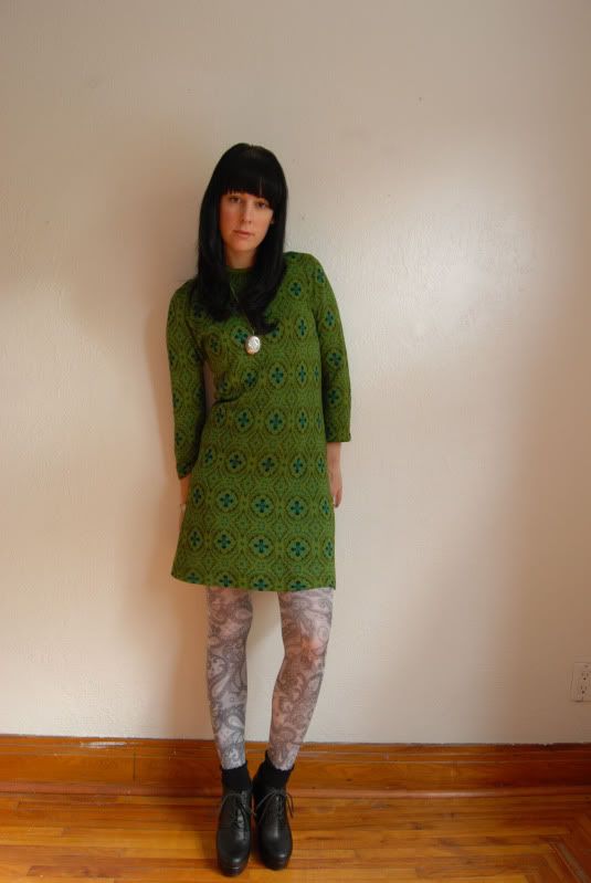 I have had this dress for a few years now, I always put it away in the Spring and in the Fall I rediscover it every time. It is a 60s knit dress in this lovely shade of green one of my favorite colors with black crosses knitted into the pattern. It is a simple cut dress but I always feel like a million bucks in it. I top the dress off with a vintage silver locket pendant found in a garage sale, Hue Paisley tights, h&m black socks and black platform booties from XXI.