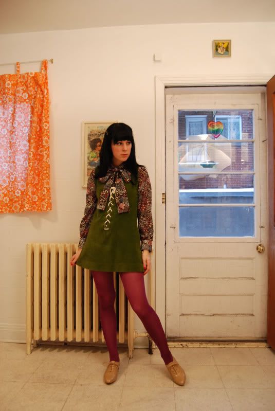 -Vintage 60s Olive Green lace up dress