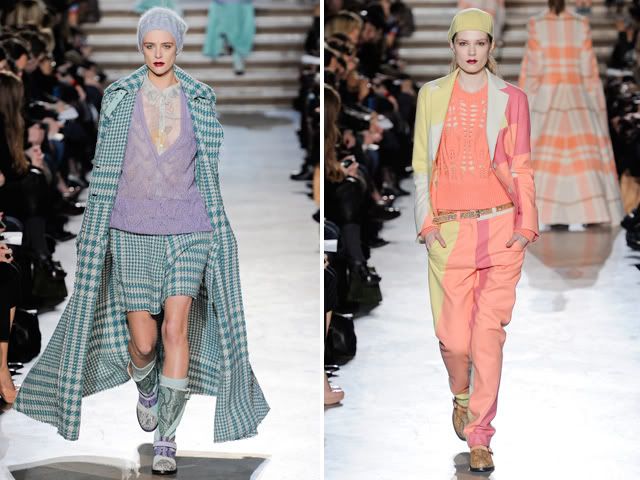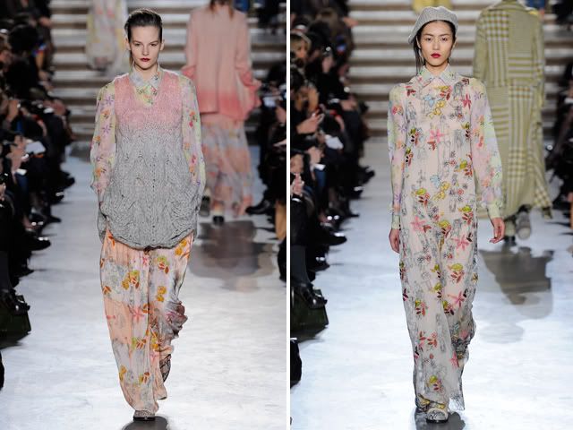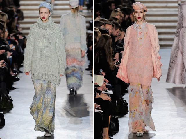Last night I was blown away by the Fall 2011 collection by one of my favorite design teams Missoni. The color palette is right on target with hues of pink, lilac and baby blue's. My heart skipped a beat for the ombre dyed knit wear and the oversize sweaters over maxi skirts. A feminine garçonne look always gets to me, everything in this collection screams comfort and cool to me, I would love to have one of everything!